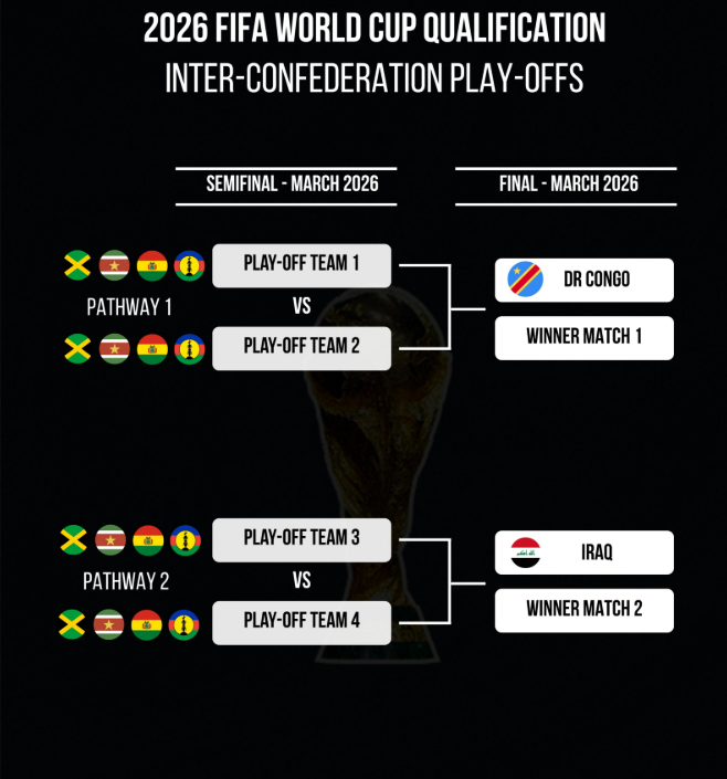 Irak y República Democrática del Congo por estar mejor ubicados en el ranking FIFA están a un partido del Mundial 2026. Los otros cuatro equipos peor rankeados: Bolivia, Jamaica, Surinam y Nueva Caledonia deberán jugar un partido más (semifinales) y los cruces serán determinados por el sorteo que realizará FIFA mañana 20 de noviembre.
