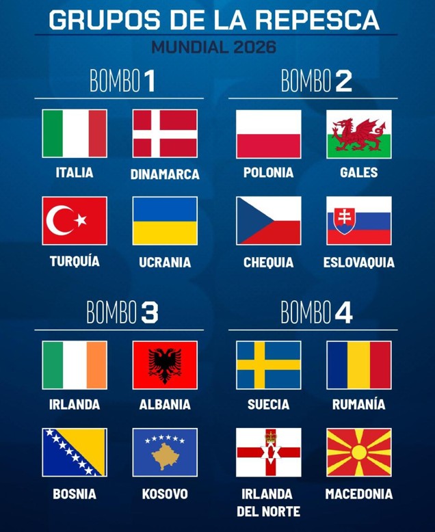 Por otra parte, tras cerrarse las Eliminatorias de la UEFA, quedaron definidas las 16 selecciones que irán por 4 cupos al Mundial. Habrá 4 bombos y mañana la FIFA realizará el sorteo para determinar los 4 cruces por los cupos a la copa del mundo.