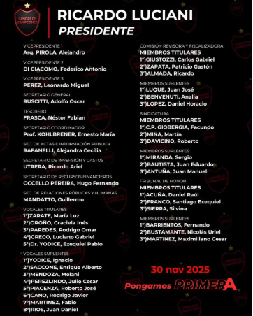 Encabezada por Ricardo Luciani, estará acompañada por Alejandro Pirola (vicepresidente 1°), Federico Di Giácomo, Leonardo Pérez, Fabián Frasca, Adolfo Ruscitti, Alejandra Raffanelli y Ariel Utrera, entre otros.