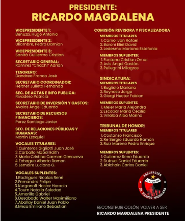 El exdirigente Ricardo Magdalena encabeza esta lista, acompañado por Hugo Benuzzi, Pedro Uliambre, Guillermo Sanitá, Franco D’Andrea y Adrián Ramírez.