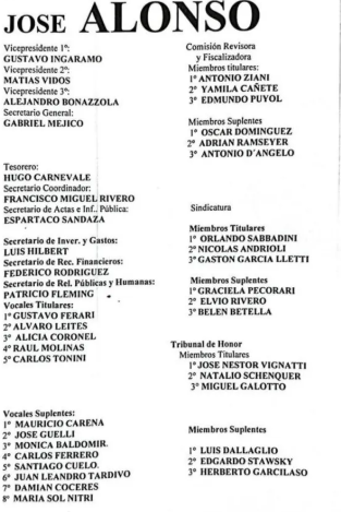 Liderada por José Alonso, con Gustavo Ingaramo como vice primero y Hugo Carnevale como tesorero.