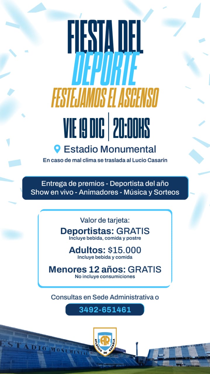 Atlético Rafaela celebra el regreso a la Primera Nacional junto a sus socios e hinchas este viernes. La Crema festeja el ascenso del Federal A con la «Fiesta del Deporte» este viernes 19 de diciembre a las 20 en el Estadio Monumental.