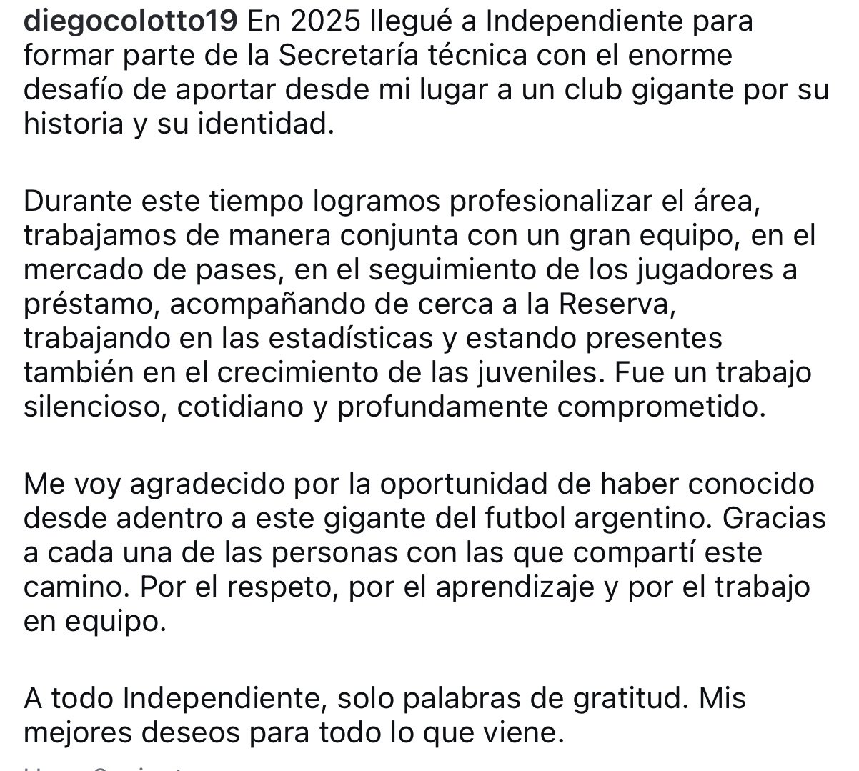 Colotto, de 44 años, viene de Independiente donde trabajó como secretario técnico con Alejandro Tocalli en este 2025. El ex defensor de Estudiantes, Lanús y Quilmes tuvo su carrera en el exterior donde se desempeñó en Tecos y Atlas de México, Deportivo La Coruña y Espanyol de España. Tras su retiro en Quilmes, se desempeño como mánager del Cervecero durante tres años entre 2018 y 2021 pero, tras perder la final por el ascenso frente a Barracas, decidió renunciar.
