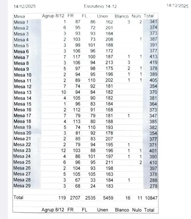 En tercer lugar, Juan Cúneo con «Fuerza Leprosa» y cuarto finalizó Guillermo Muñoz «8 de mayo» con 119 votos, el 1,1%. Además, hubo 16 votos en blanco y 11 anulados.