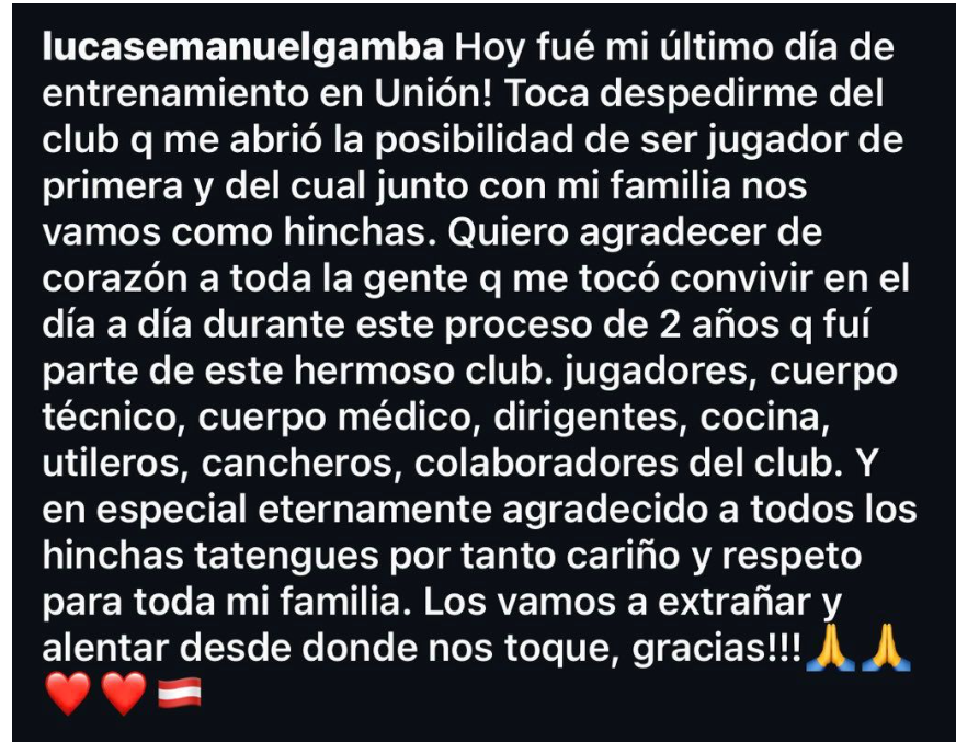El mendocino Lucas Gamba publicó un mensaje de despedida en sus redes sociales para agradecer a todos en su último ciclo en el club.