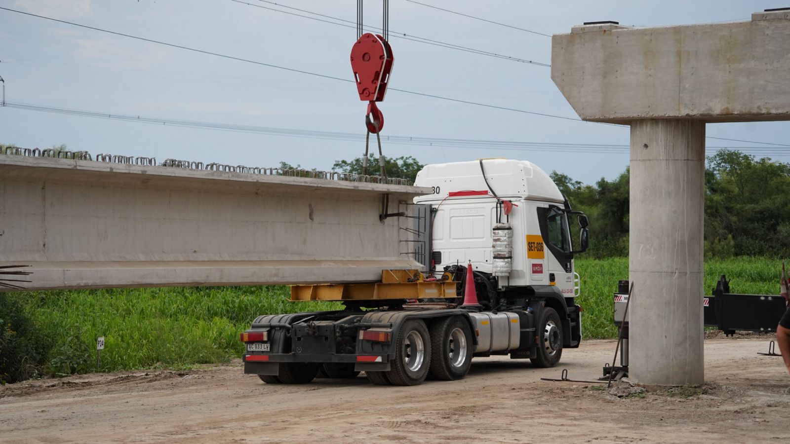 Para el traslado de las vigas se realiza un operativo especial, que debió ser autorizado por la Dirección Nacional de Vialidad, que comienza en la ciudad de San Luis, saliendo por la Ruta Nacional N° 7 hasta Rufino, luego por Ruta Nacional N° 33 hasta la Ruta Nacional A012 para tomar la Autopista Rosario – Santa Fe. Durante todo el recorrido, viajan ‘coches guía’, acompañando a los camiones, que van haciendo los cortes donde sean necesarios.