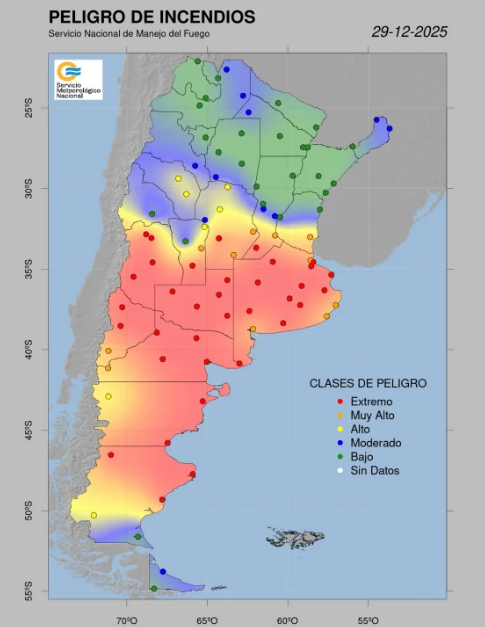 Desde el Servicio Nacional de Manejo del Fuego indican que para este lunes 29 de diciembre hay riesgo extremo de incendios en 10 provincias del país: Buenos Aires, La Pampa, Córdoba, Mendoza, San Luis, Santa Fe, Neuquén, Río Negro, Chubut y Santa Cruz.