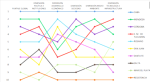 Según el ranking, la Ciudad Autónoma de Buenos Aires (CABA) es la mejor del país, con una valoración de 3,65. En el podio la acompañan Mendoza (3,34) y Córdoba (3,25). Luego continuaron San Miguel de Tucumán (3,17), Rosario (3,16), San Juan y Santa Fe (2,98), Salta (2,85), Mar del Plata (2,74) y Resistencia (2,54).