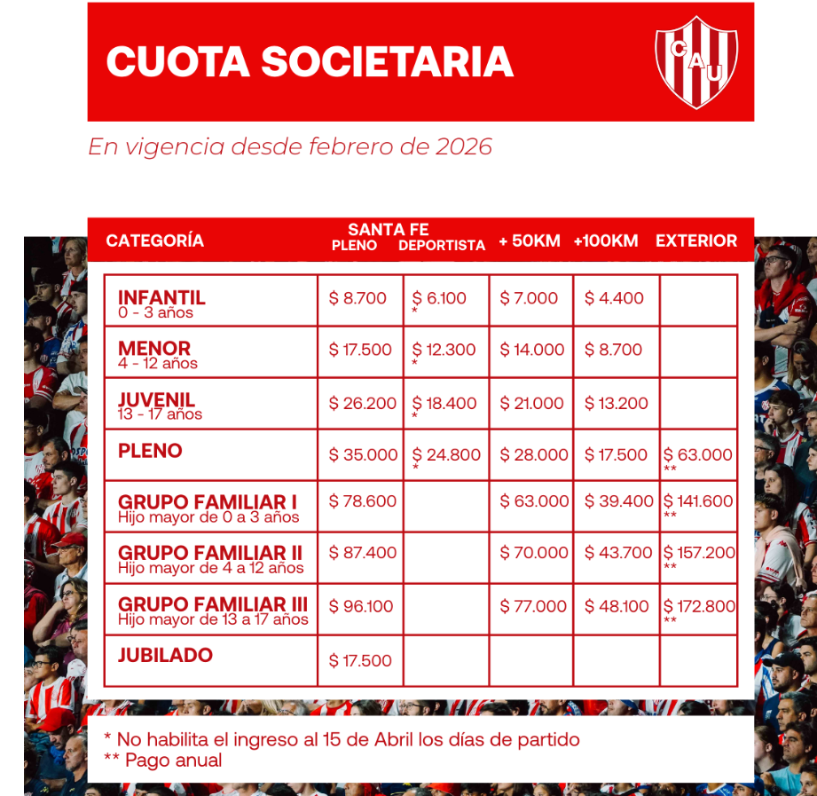 La última suba había sido en noviembre de 2025 cuando pasó de 26 mil a 30 mil pesos mensuales en la categoría socio pleno. De acuerdo al comunicado del club «tal como se venía implementando de manera trimestral , y contemplando el aumento del 33% de las entradas generales (de $ 30.000 a $ 40.000) dispuesto por la Asociación del Fútbol Argentino, la inflación y las actualizaciones de los servicios públicos y de los gastos corrientes de la institución durante los meses de noviembre y diciembre 2025 y enero 2026, informamos los nuevos valores de las cuotas societarias desde febrero».