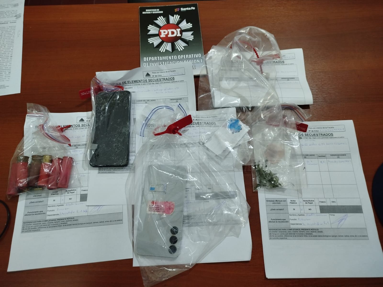 Entre los elementos incautados, se cuentan envoltorios con cocaína listos para la venta, picadura de marihuana y una planta de cannabis (con reactivos positivos en peritajes de campo); elementos de fraccionamiento como recortes de nailon, bolsas plásticas y tijeras; 4 teléfonos celulares que serán sometidos a peritaje; cartuchos de escopeta calibre 16 y cartuchos calibre 22.