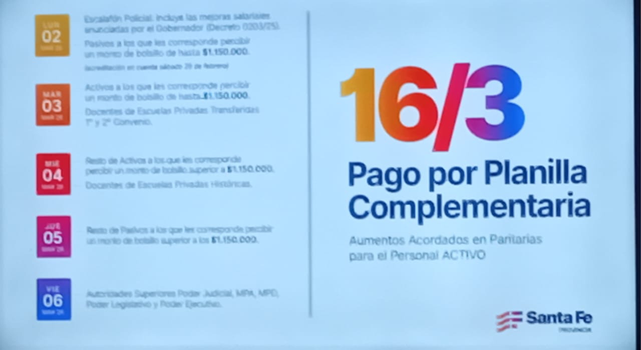 El Gobierno de Santa Fe dio a conocer este viernes el cronograma de pago correspondiente a los haberes de febrero para trabajadores activos y pasivos de la administración pública. Además, precisó la modalidad en la que se liquidarán los aumentos salariales acordados en paritarias y los adicionales sectoriales, que se abonarán a través de una planilla complementaria.