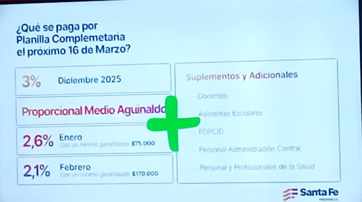 El 3% correspondiente a diciembre de 2025 se toma como nueva base salarial. Sobre ese valor se calculan las diferencias de enero y febrero, además del proporcional del SAC. En total, la planilla complementaria contendrá cuatro liquidaciones: diciembre, aguinaldo, enero y febrero, que se abonarán en una sola fecha.