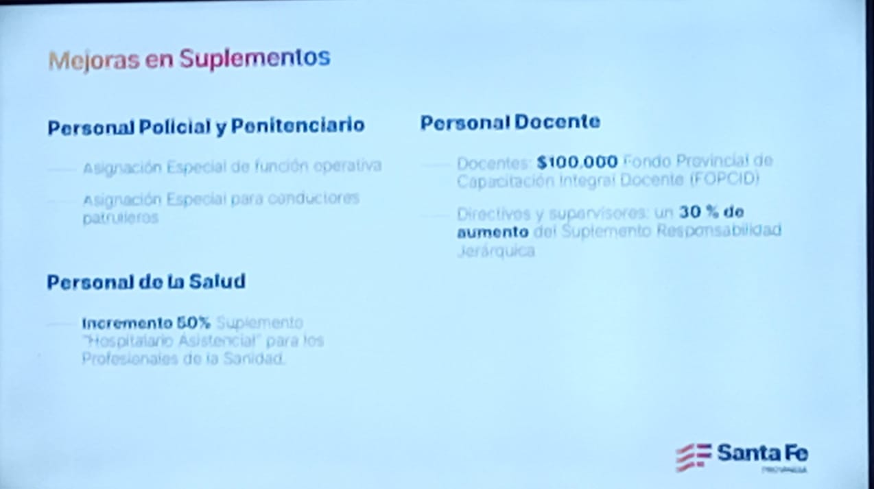En salud, se incrementó el suplemento de asistentes hospitalarios, mientras que en el sector docente se reconoció un 30% de aumento en el suplemento por responsabilidad jerárquica y la creación de un fondo de capacitación y formación. Todos estos conceptos se verán reflejados en la planilla complementaria.