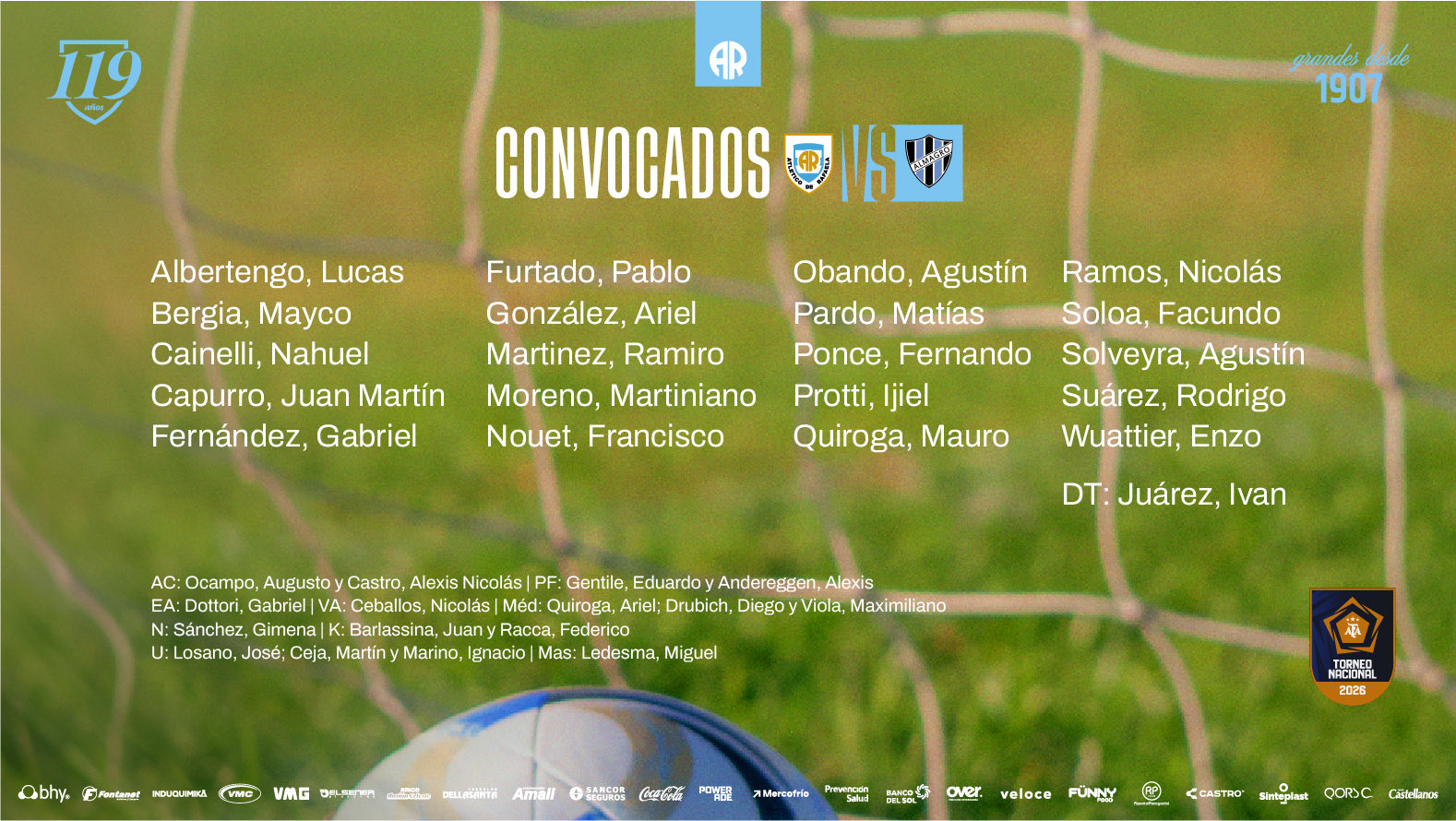 Atlético Rafaela: Mayco Bergia/ Agustín Solveyra, Nicolás Ramos, Fernando Ponce y Enzo Wuattier/ Nahuel Cainelli, Facundo Soloa y Juan Capurro/ Agustín Obando, Ijiel Protti o Martiniano Moreno y Mauro Quiroga. DT: Iván Juárez.