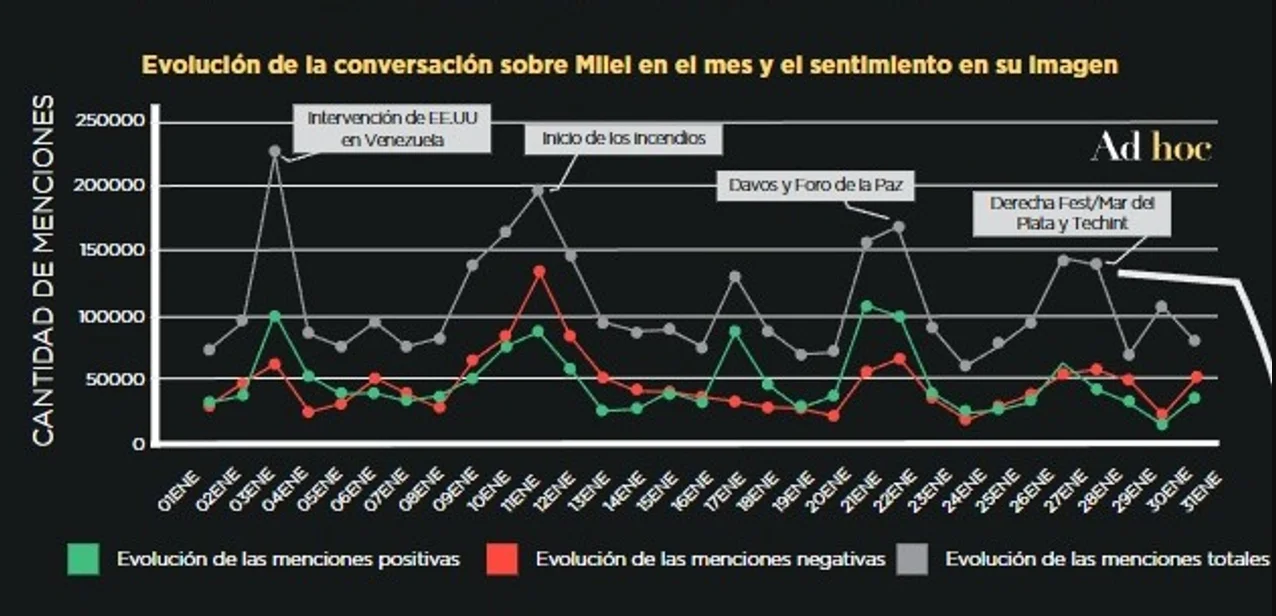 Según la consultora Ad Hoc, el “sentimiento digital positivo” durante el primer mes del año se registró en torno al 47% y se refleja en menciones vinculadas a las celebraciones del secuestro de Nicolás Maduro en Venezuela, llevado adelante por el gobierno Donald Trump, y su vínculo con Estados Unidos.