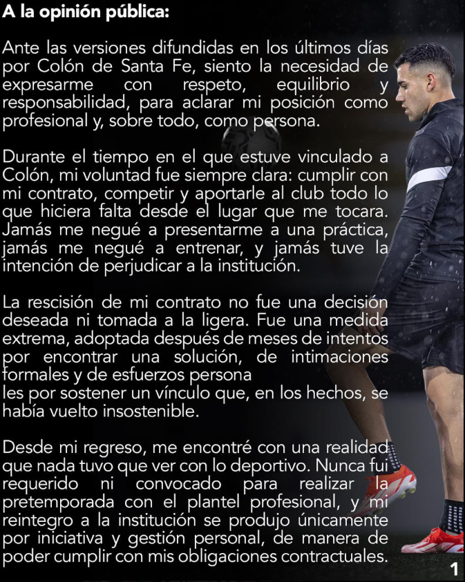 José Neris realizó un descargo tras rescindir su contrato con Colón y expuso su versión de los hechos en un conflicto que todo indica escalará hasta el TAS. El delantero uruguayo utilizó en las últimas horas, la red social Instagram, para dejar sentada su postura sobre las razones que llevaron a la desvinculación de Colón.