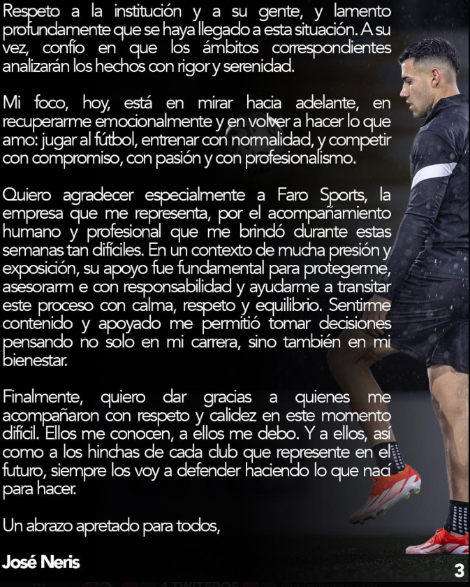 Neris deja en claro que «la rescisión de mi contrato no fue una decisión deseada ni tomada a la ligera».