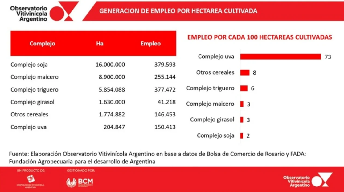 Según un estudio del Observatorio Vitivinícola Argentino (2024), es la industria que más empleo genera por hectárea en el agro nacional: 73 puestos, muy por encima de otros cultivos, como los cereales (8), el trigo (6), el maíz y el girasol (3) y la soja (2).