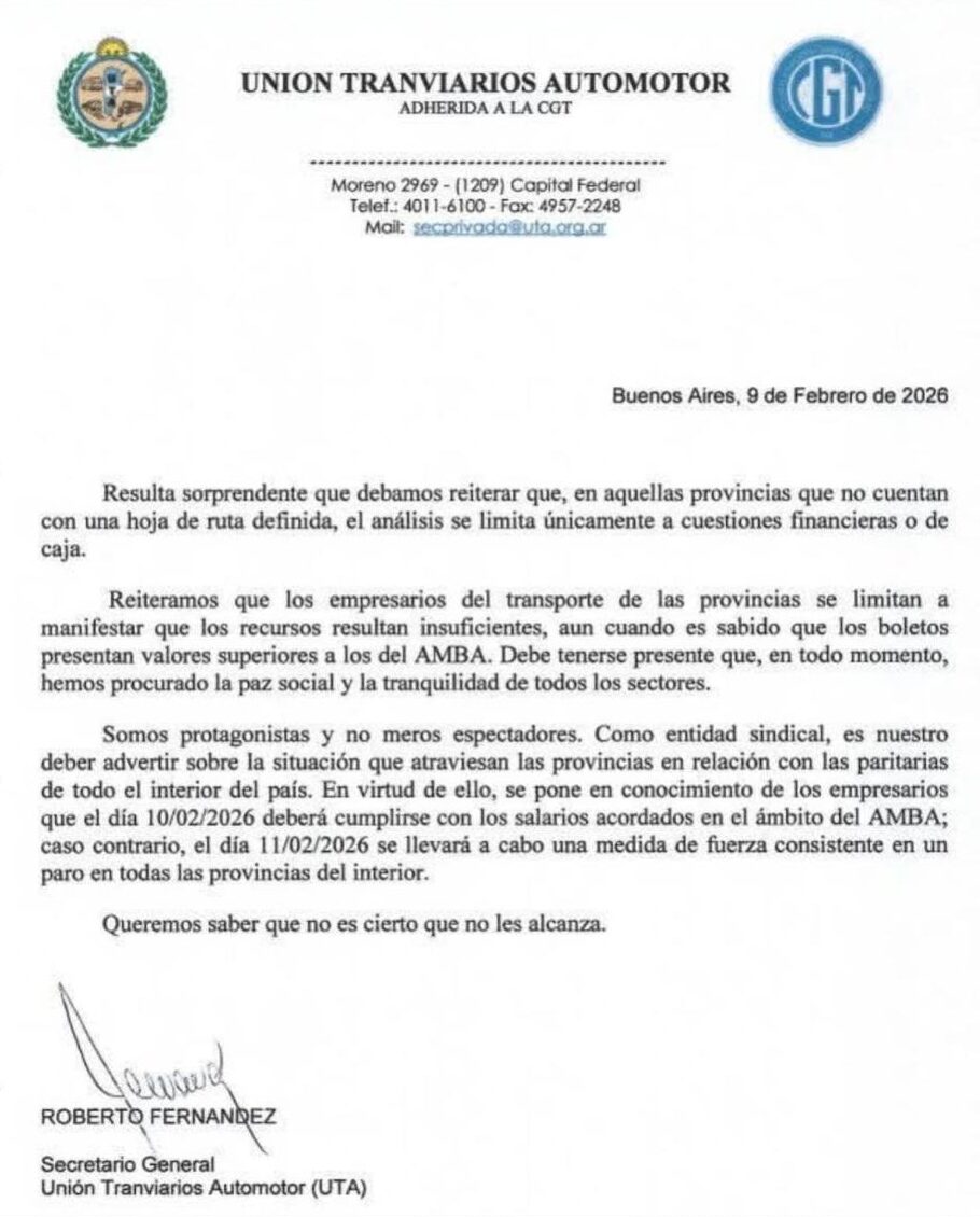 A nivel nacional, la UTA, conducida por Roberto Fernández, difundió un comunicado en el que advirtió que, si las empresas del interior no replican el acuerdo salarial alcanzado en el Área Metropolitana de Buenos Aires (AMBA), se avanzará con una medida de fuerza en todas las provincias. El entendimiento firmado para el AMBA contempla aumentos del 1,4% en enero, 1,3% en febrero y 1,3% en marzo, además de una suma no remunerativa total de 320.000 pesos, a abonarse en tres tramos: 100.000 en enero, 100.000 en febrero y 120.000 en marzo.