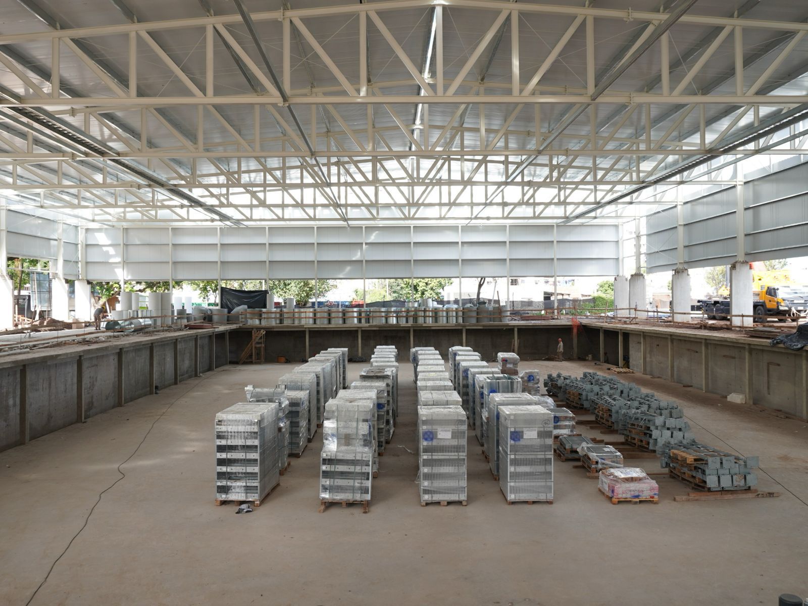 En los últimos días llegaron cinco de los ochos contenedores con el material para el armado de las piletas. Ya se hormigonó el 100 % de las losas sobre subsuelo y se colocó gran parte de los paneles isotérmicos de cubierta y verticales de cerramiento en los frentes norte y sur.