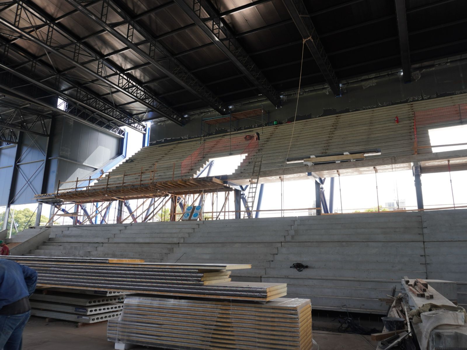 La empresa a cargo de la obra finalizó el montaje de paneles de cubierta y se inició la colocación de cerramientos en platea alta.