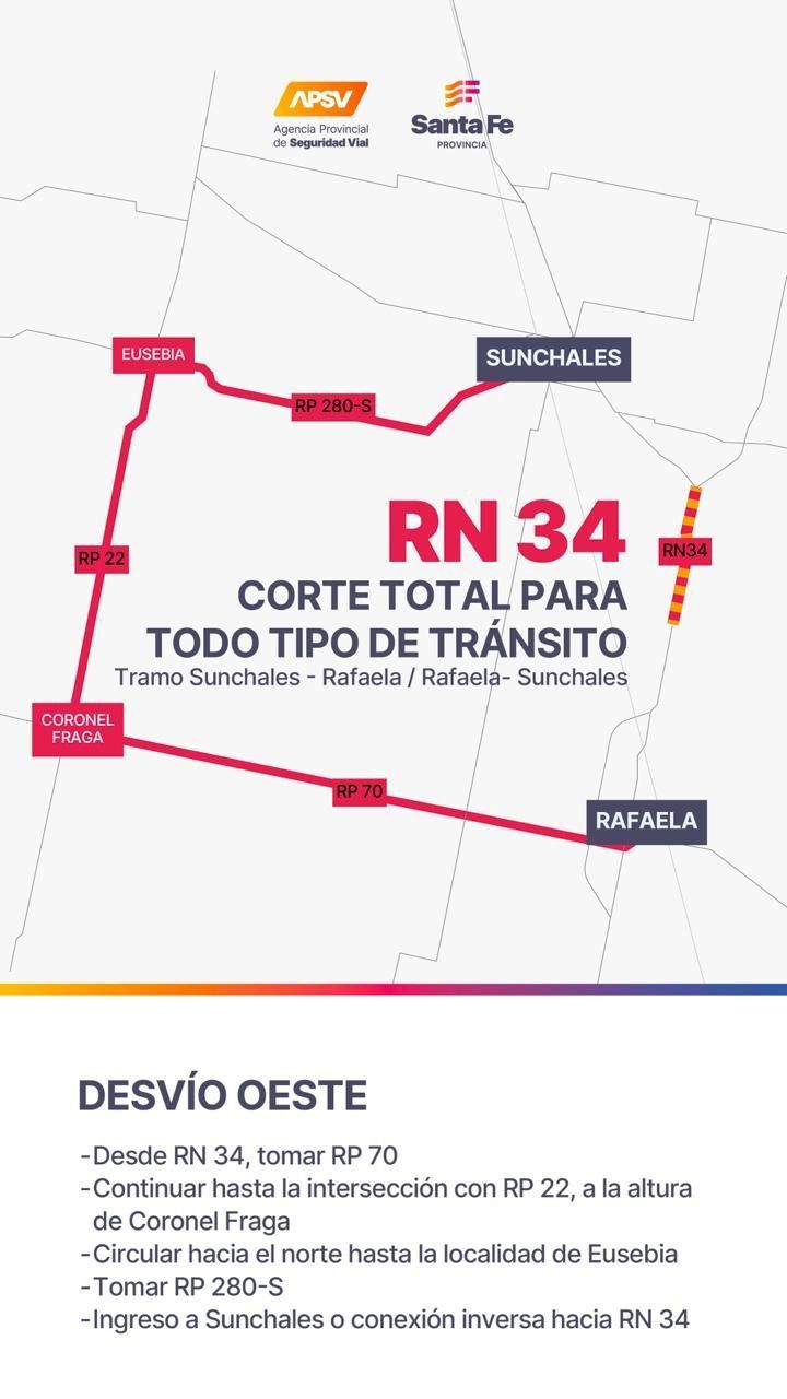 Mientras tanto, se mantienen los desvíos habilitados por dos corredores alternativos pavimentados, habilitados para la circulación en ambos sentidos (Rafaela–Sunchales y Sunchales-Rafaela):