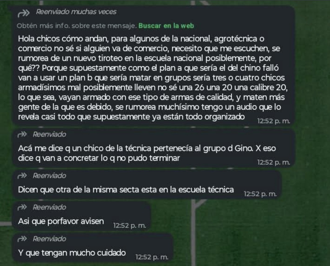 El texto viralizado hacía referencia a un supuesto “Plan B” y a la posibilidad de que otro grupo armado intentara concretar un nuevo ataque. También mencionaba posibles vínculos con entornos digitales, lo que sumó aún más preocupación entre las familias.