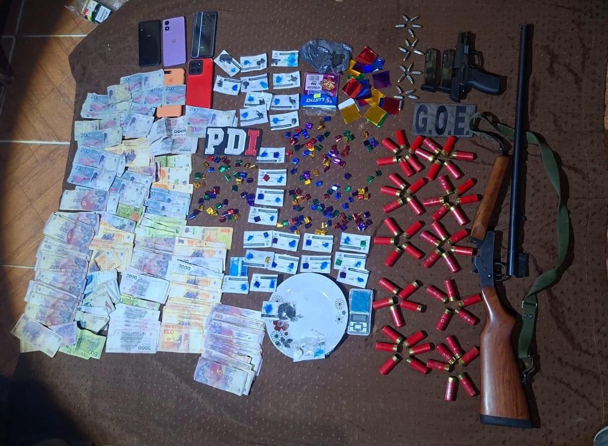 Además, en ese domicilio la PDI secuestró 97.250 pesos en efectivo, una notebook, una escopeta calibre 12 con 56 cartuchos intactos y una pistola calibre 9 milímetros con dos cargadores y municiones, entre otros elementos vinculados con la investigación.